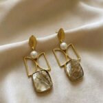 stones centrepieces , surrounded by lustrous, irregular white petals that catch the light beautifully. The matching drop earrings feature a hammered gold-tone stud, adding a textured, artisanal finish to the look.