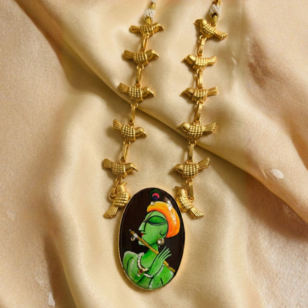 This unique necklace combines the charm of nature with spiritual grace. The chain is crafted from a cascade of golden birds, leading down to a magnificent portrait of Lord Krishna. Reminiscent of traditional Pichwai or miniature paintings, the vibrant green and orange hues of the pendant pop beautifully against the gold. It’s not just jewellery,it’s wearable blessing. Wear a piece of art that tells a story.